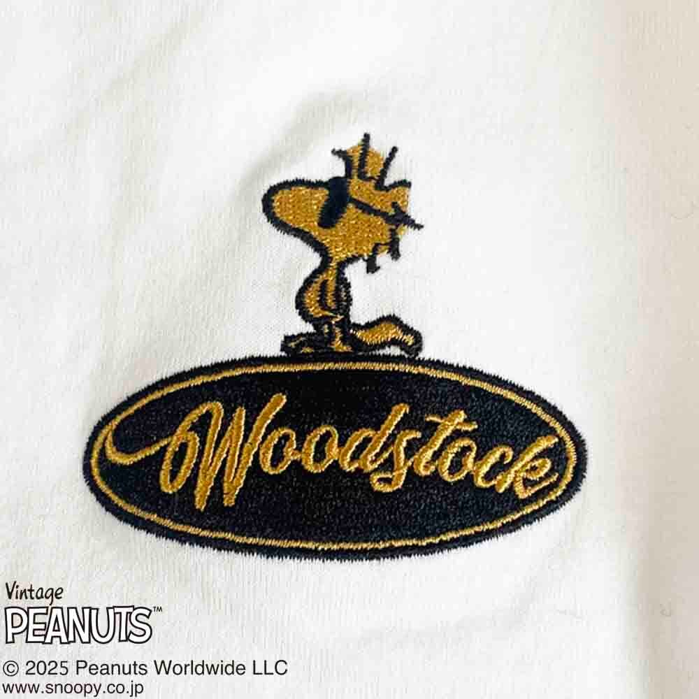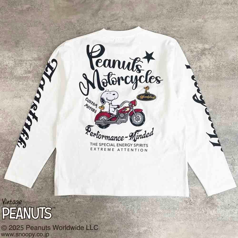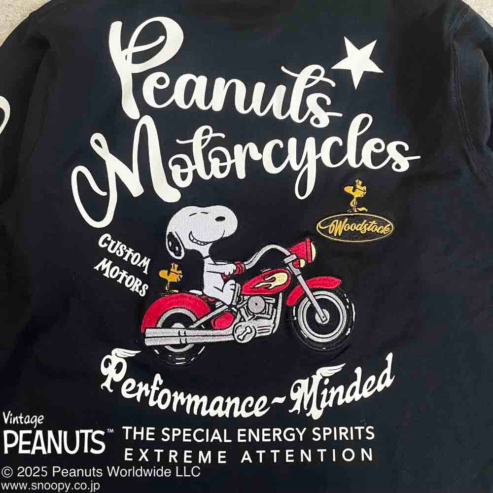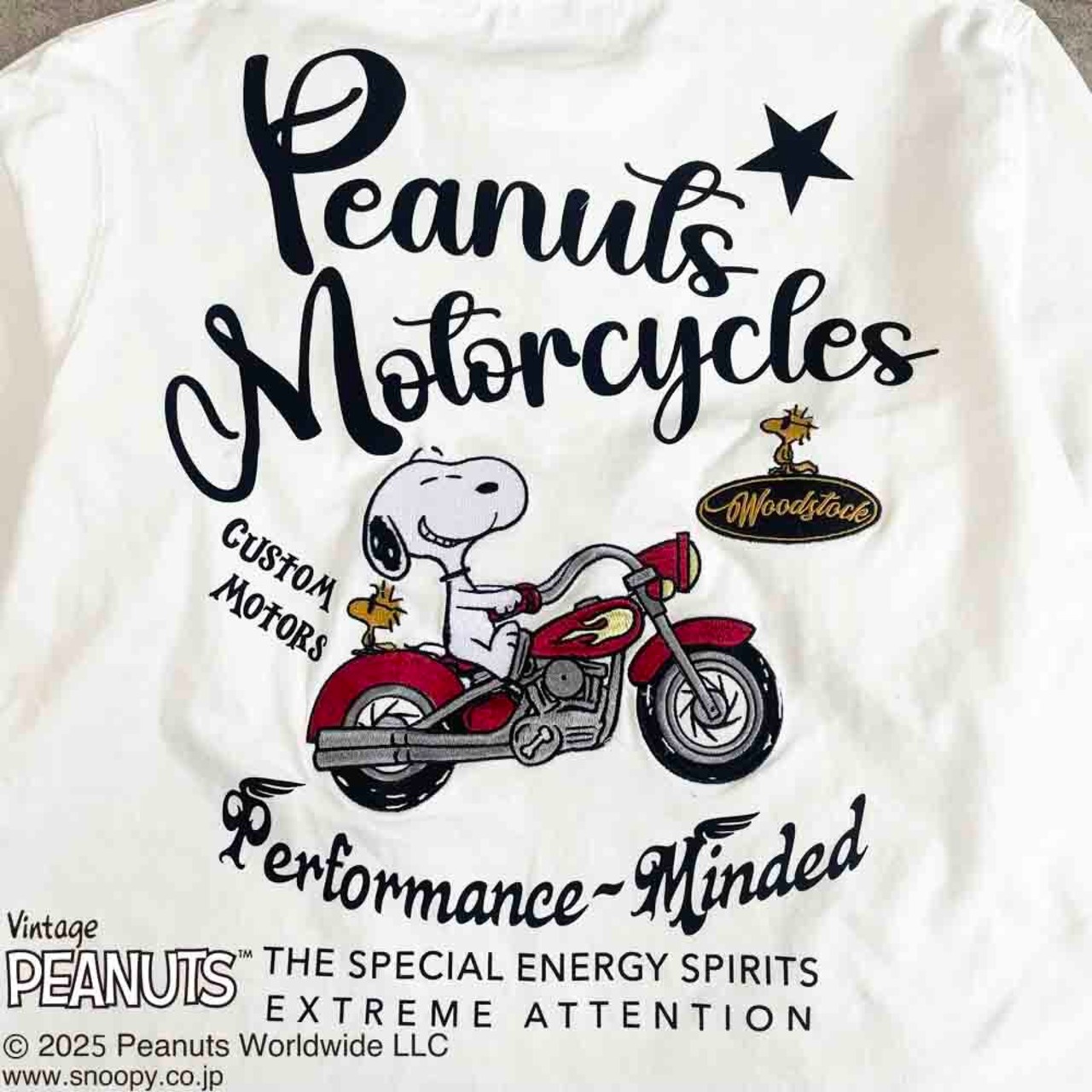 ヴィンテージ感のあるアメリカンバイクに乗ったSNOOPYを大胆に刺繍!