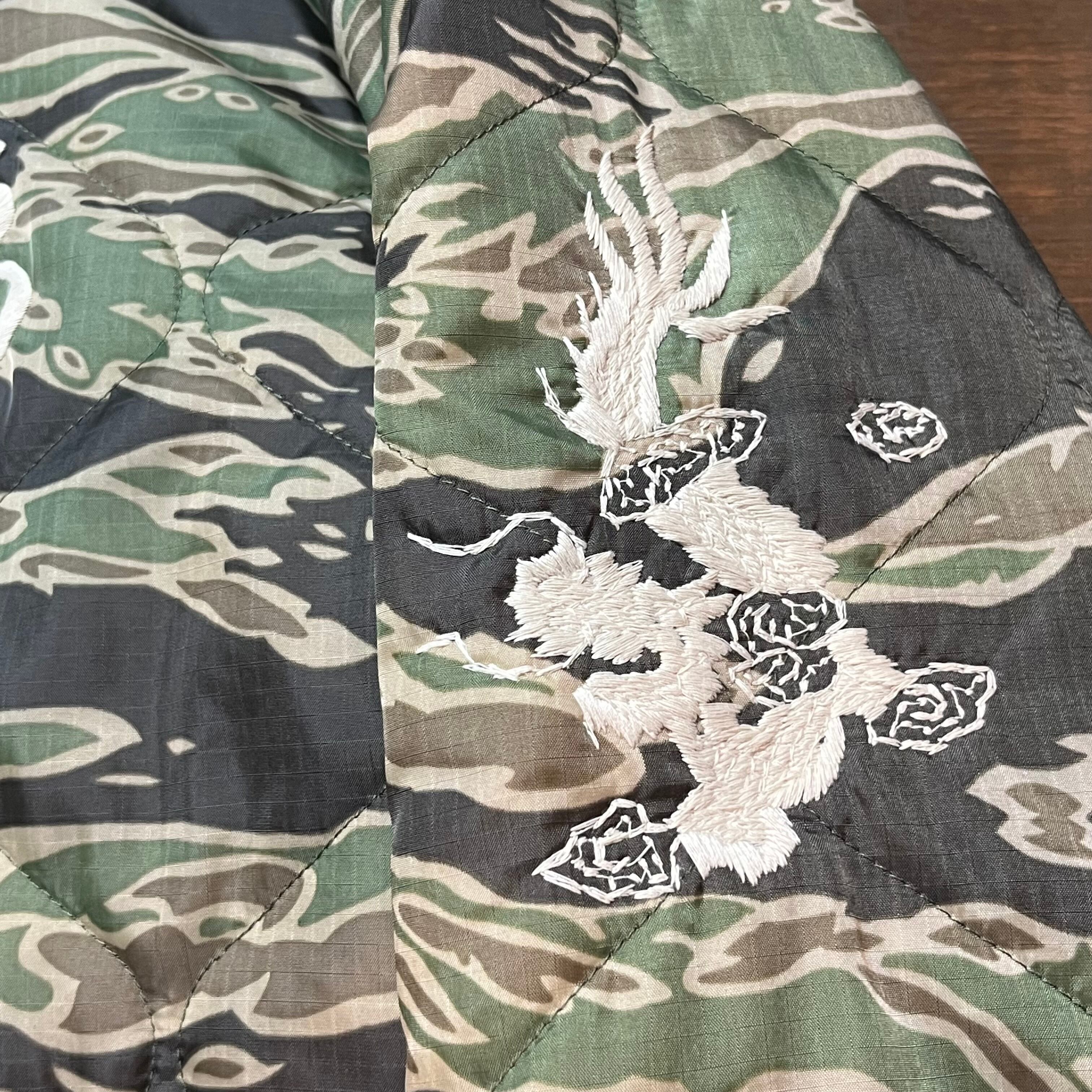 ベトナム戦争時、米軍の軍港が置かれた都市NHATRANG(ニャチャン)。1960 年代中期にその激戦地へ駐留していた兵士のカスタムオーダー品。背中は王道のマップ柄だが、このように白一色で刺繍されたベトジャンはヴィンテージでも珍しい。表地は瓢箪型のキルティングが入ったミリタリー由来のナイロンリップストップ。裏地には着心地を考慮してサテンが使われ、中綿入りのため適度な防寒性も備えている。通常、ライナー生地はウッドランド迷彩だが、本作はタイガーストライプを落とし込んだオリジナルモデル。