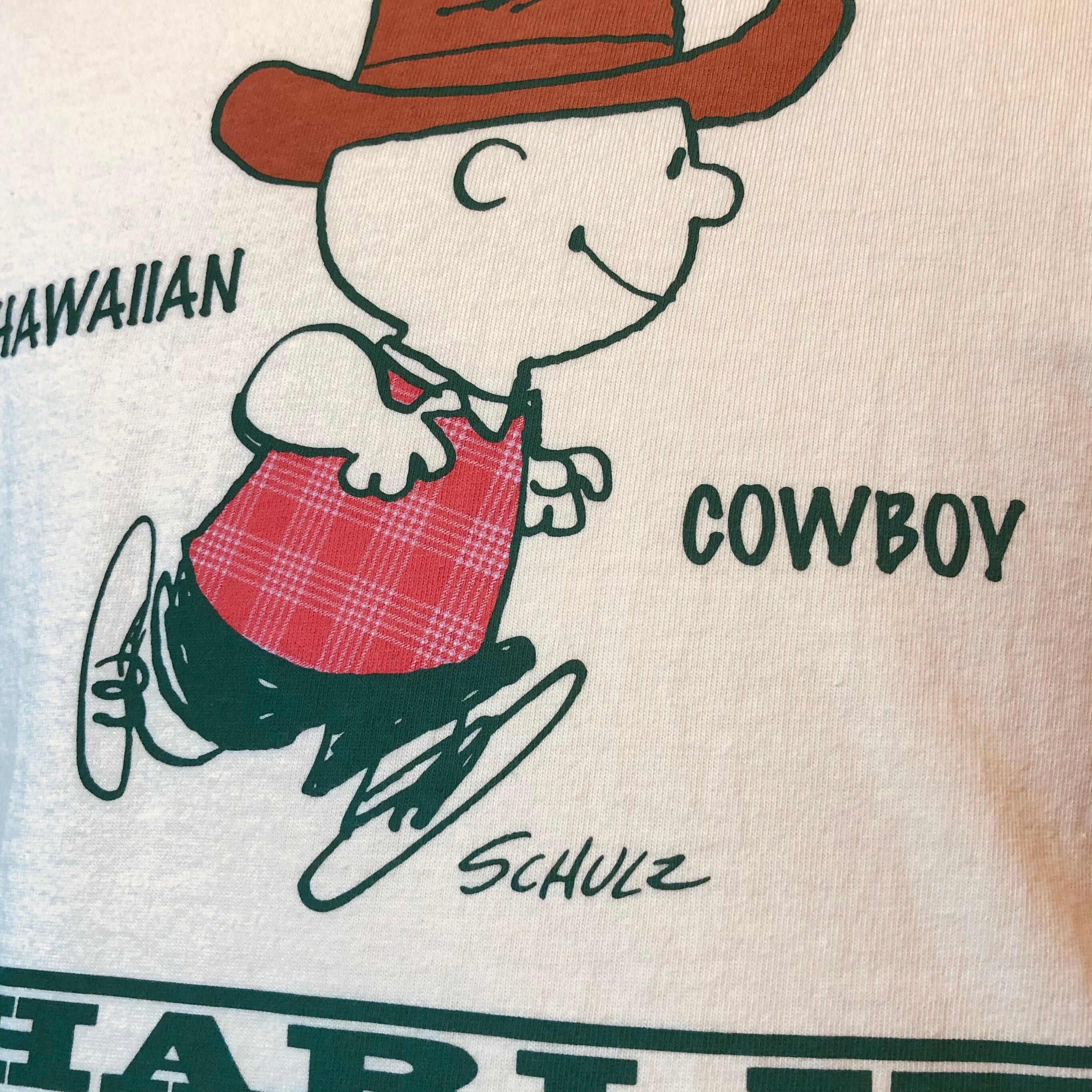毎年好評のこのシリーズより、カウボーイに扮したチャーリーブラウンのプリントTです。肌触りが良く、しっかりとした作りのアメリカ製で両サイドに縫い目のない丸胴ボディです。