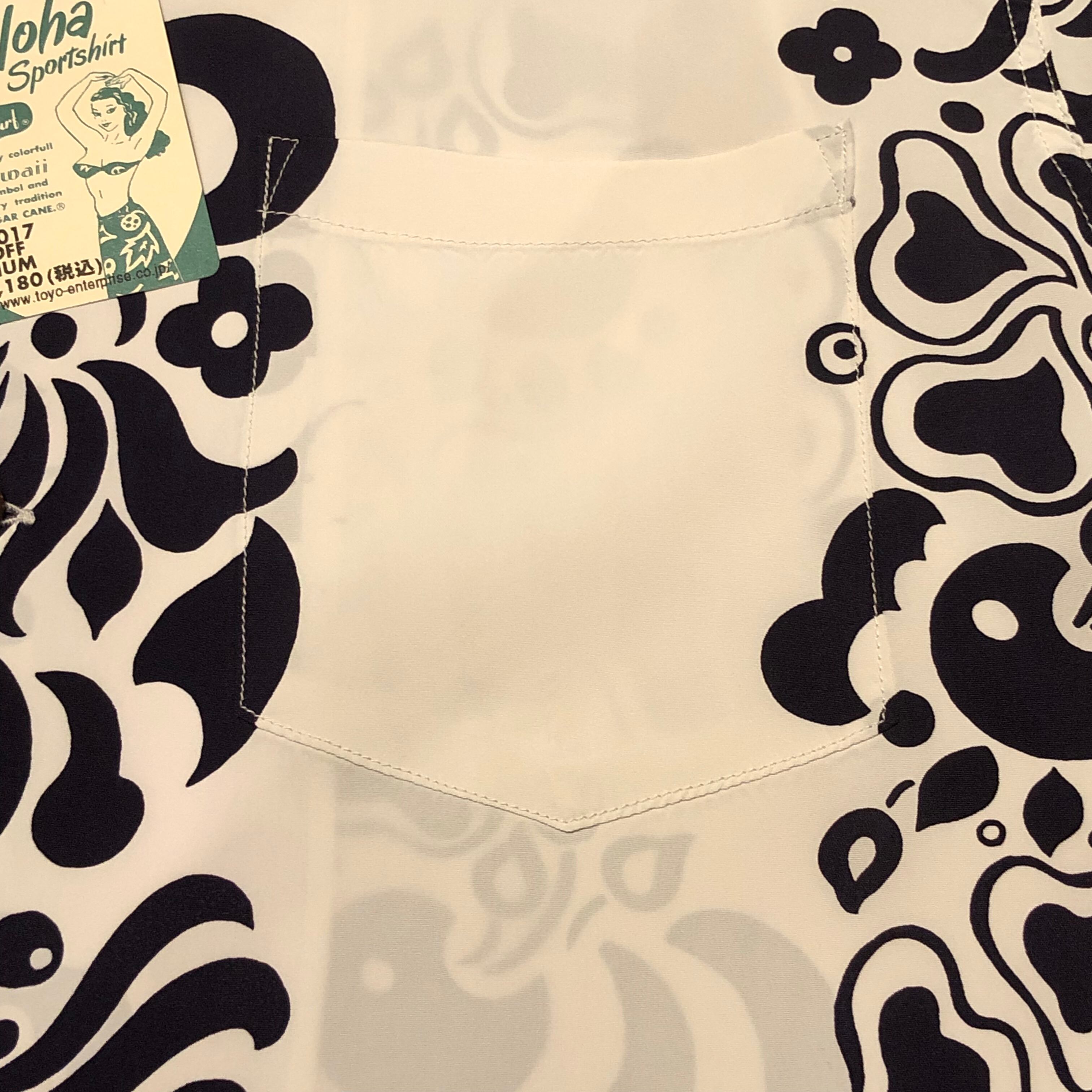 オリジナルを手掛けたのは戦前にホノルルのダウンタウンで創業した老舗ブランド「ワイキキアン」。本作のような単色のボーダー・パターンはアロハシャツの歴史の中でも最初期から見られる伝統的な柄で、タヒチなどからハワイに入ってきた。その当時、特に人気だったのはタヒチの民族衣装「パレウ」に使われていたデザインで、抽象的に描かれた花柄を白く染め抜いたもの。古くからフランスで使われていたデザインパターンであったが、同国の植民地であるタヒチに持ち込まれ、後にハワイでアロハシャツの柄として定着し、多くの絵柄が作られた。